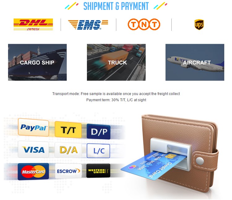 A: For first time we prefer to T/T or you can choose PayPal if not a big amount.Other terms of payment such as D/P,D/A,L/T,Western Union we can also accept.